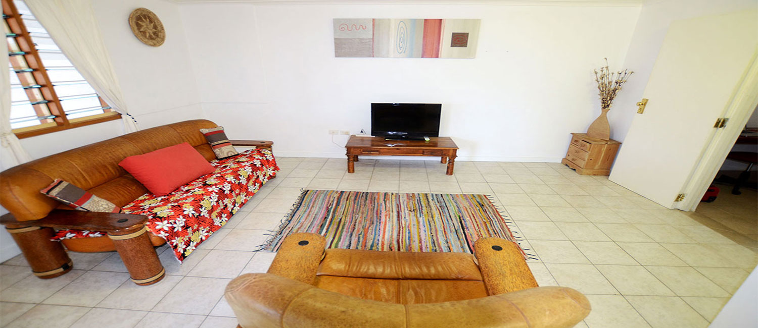 The apartment comes furnished with Pacific Green lounge suite, wall-mounted fan and a bar area with sink and more cupboards. The apartment has air-con and ceiling fan in the main living area, ceiling fan in the front bedroom, air-con in the back bedroom and large breezy windows throughout. Ideal for expatriates working in Nadi - it's less than a minute walk to Smugglers Cove Resort and Wailoaloa beach.